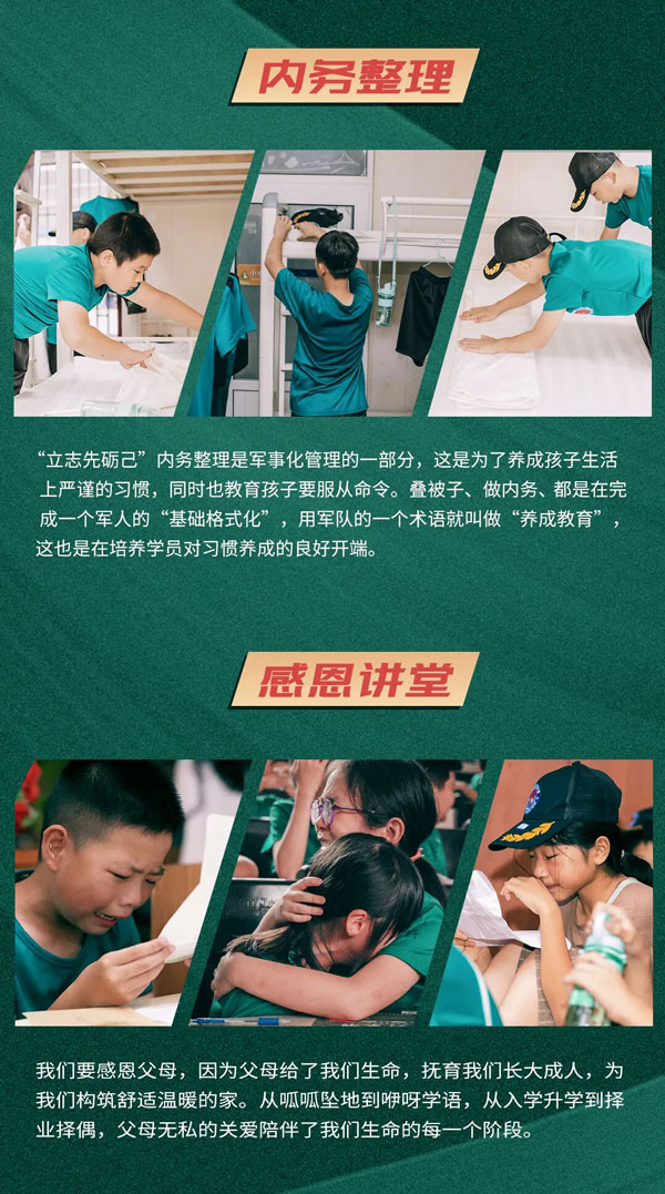 住宿安排:标准的8-10人间,配有:空调,热水器,独立洗浴间,床铺,枕头,被子,保证小战士入营有充足的物资保障。