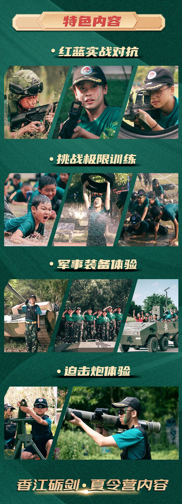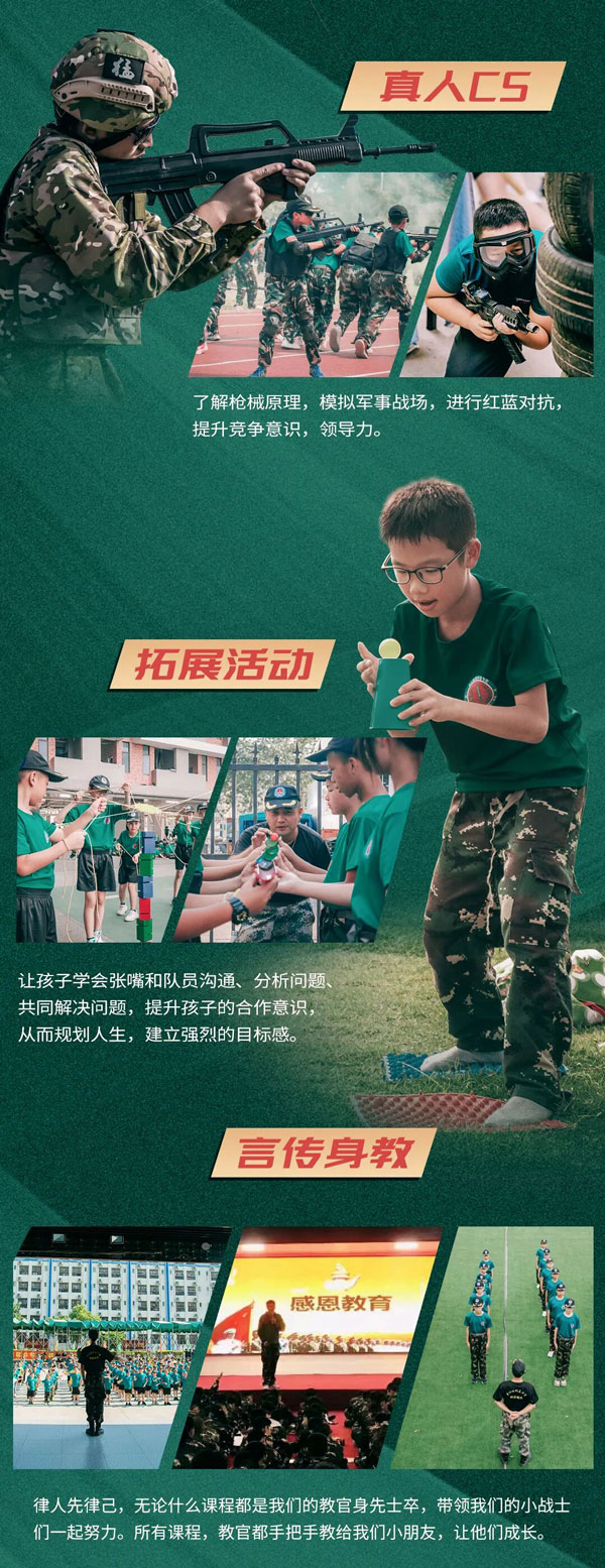 | 下午 | 我是一个兵3.队列,擒敌拳(基础格斗动作,锻炼身体的同时培养孩子敢于竞争的不服输精神) 拓展体验--罗马炮架(培养孩子的动手能力和协作能力) |