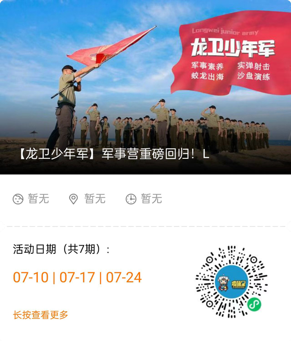 龙卫少年军事营可以使我们的营员学会自己照顾自己、帮助别人、磨炼意志、探索未来,通过多元化、趣味性的军事活动,培养青少年的自学、自立、自强、自律等能力。军事营虽不会让他们立马变强大,但会在孩子心中种下一颗种子,让他们知道纪律的重要性,知道今天美好的生活多么来之不易。